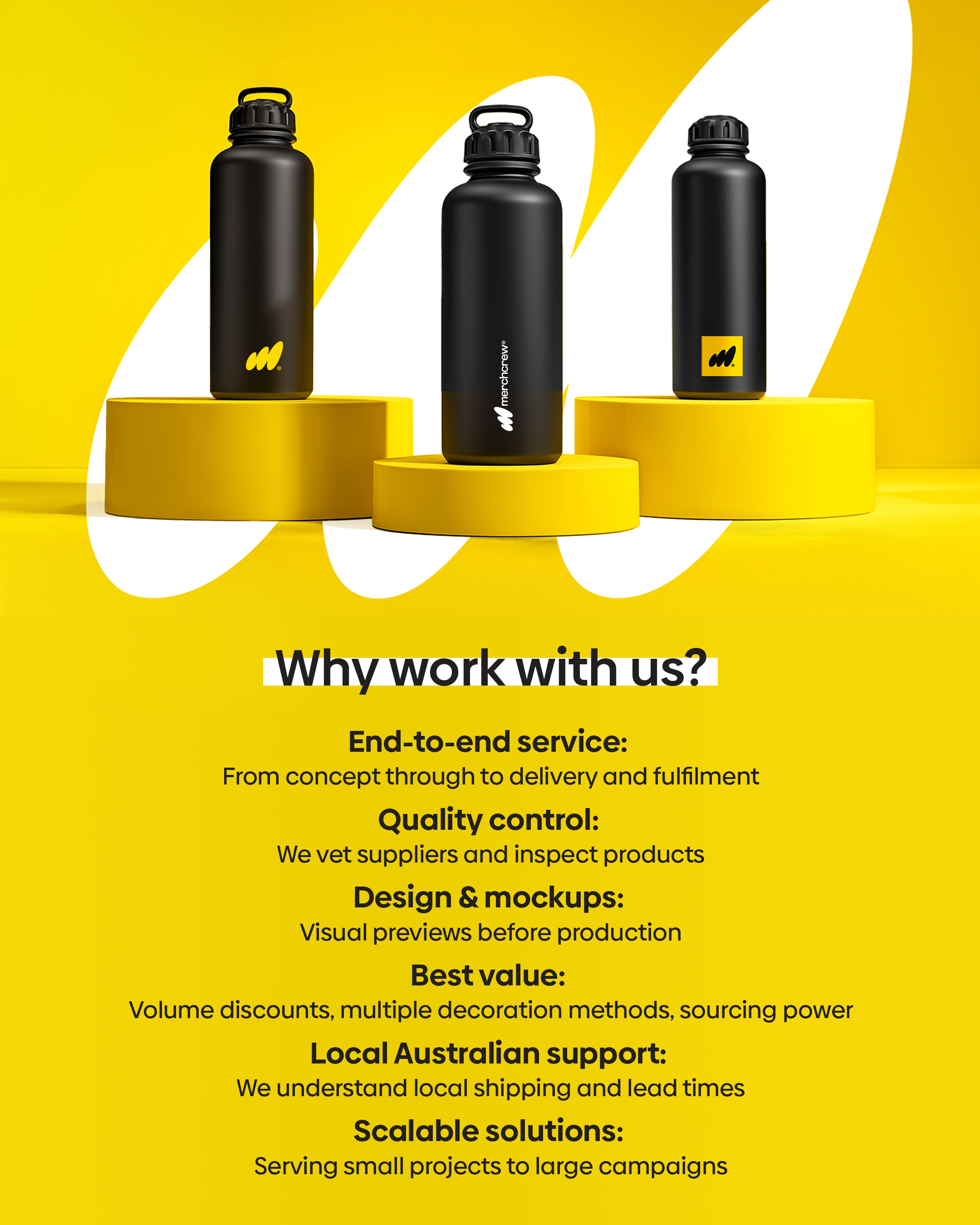 Promotional merchandise (also called branded merch or promotional products) are everyday items customised with your logo, slogan, or brand design. Think T-shirts, water bottles, pens, or tote bags. These items turn into mini billboards — helping to boost brand awareness, customer loyalty, and recall every time they are used.